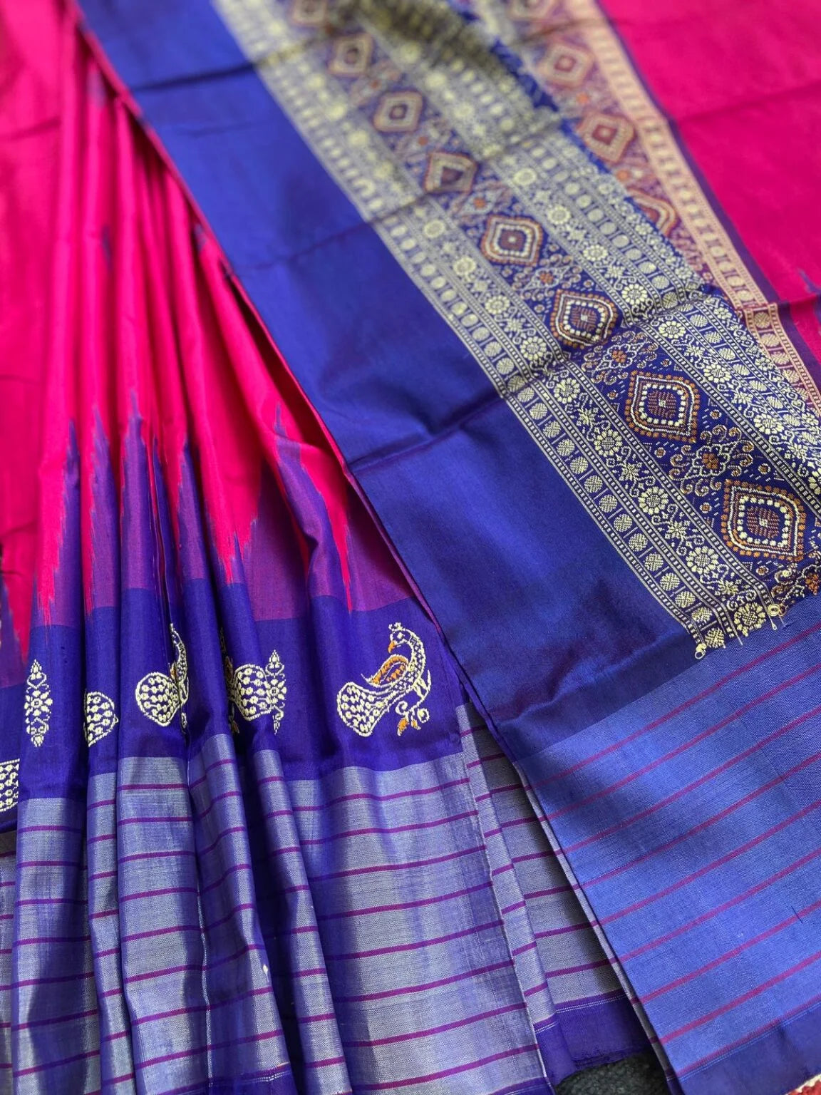 • Handwoven tie-dye ikat “Dancing Peacocks 🦚 & floras ” mulberry silk Saree